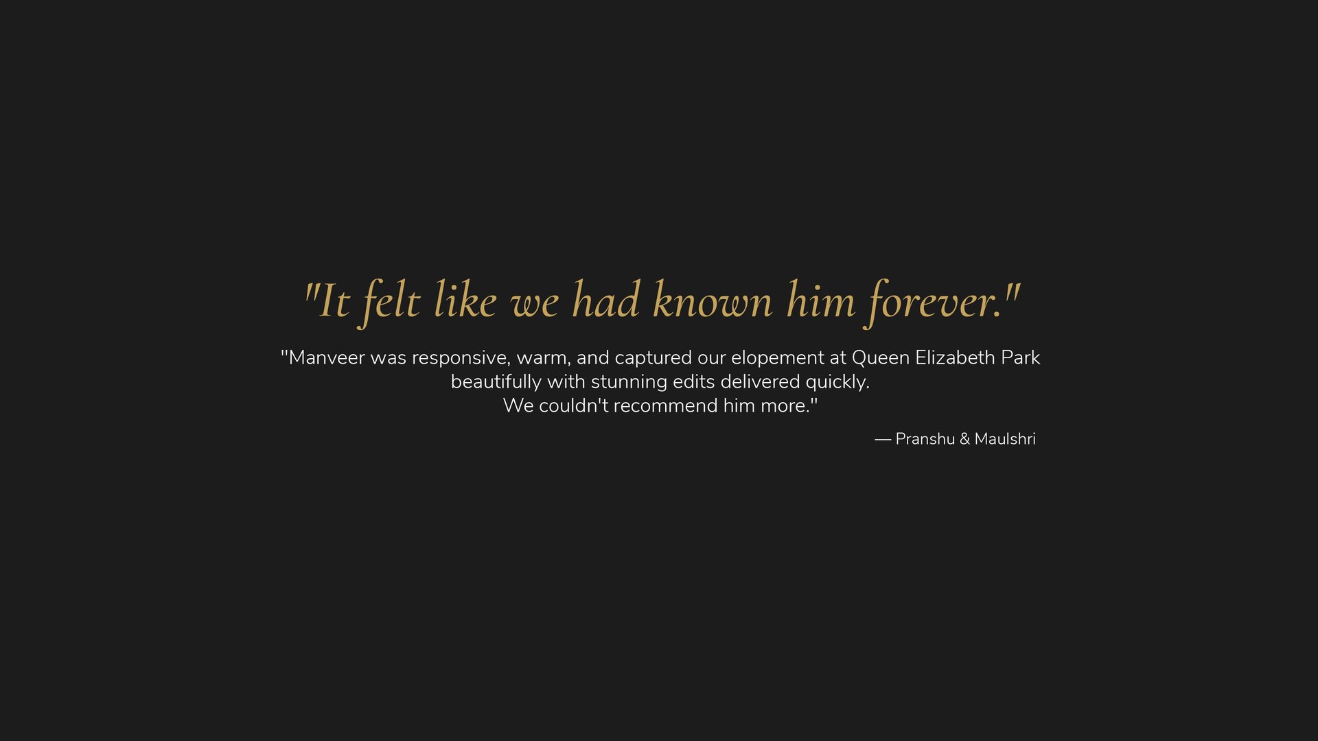 We were also impressed by how quickly he delivered the beautifully edited videos in his unique style. Thank you, Manveer, for capturing our day so perfectly and giving us lifetime memories. Highly recommended working with him! "